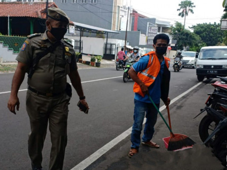 Sebanyak 10 pelanggar protokol kesehatan dikenakan sanksi kerja sosial dalam giat tertib masker di Jalan Tebet Timur Dalam ll, Jakarta Selatan, Selasa (20/10).
