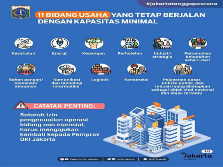Adapun 11 bidang usaha yang tetap berjalan dengan kapasitas minimal saat penerapan PSBB di Jakarta yakni, kesehatan, energi, keuangan, perhotelan, industri strategis dan bidang usaha pemenuhan kebutuhan sehari-hari.