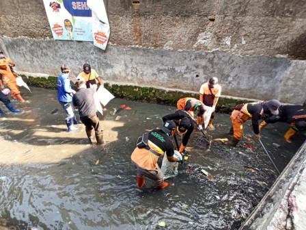 Sebanyak 20 petugas gabungan UPK Badan Air Dinas Lingkungan Hidup dan Satgas Sudin Sumber Daya Air (SDA) Jakarta Selatan, membersihkan sampah di Kali Sekretaris wilayah RW 06, Kelurahan Cipulir, Pesanggrahan.