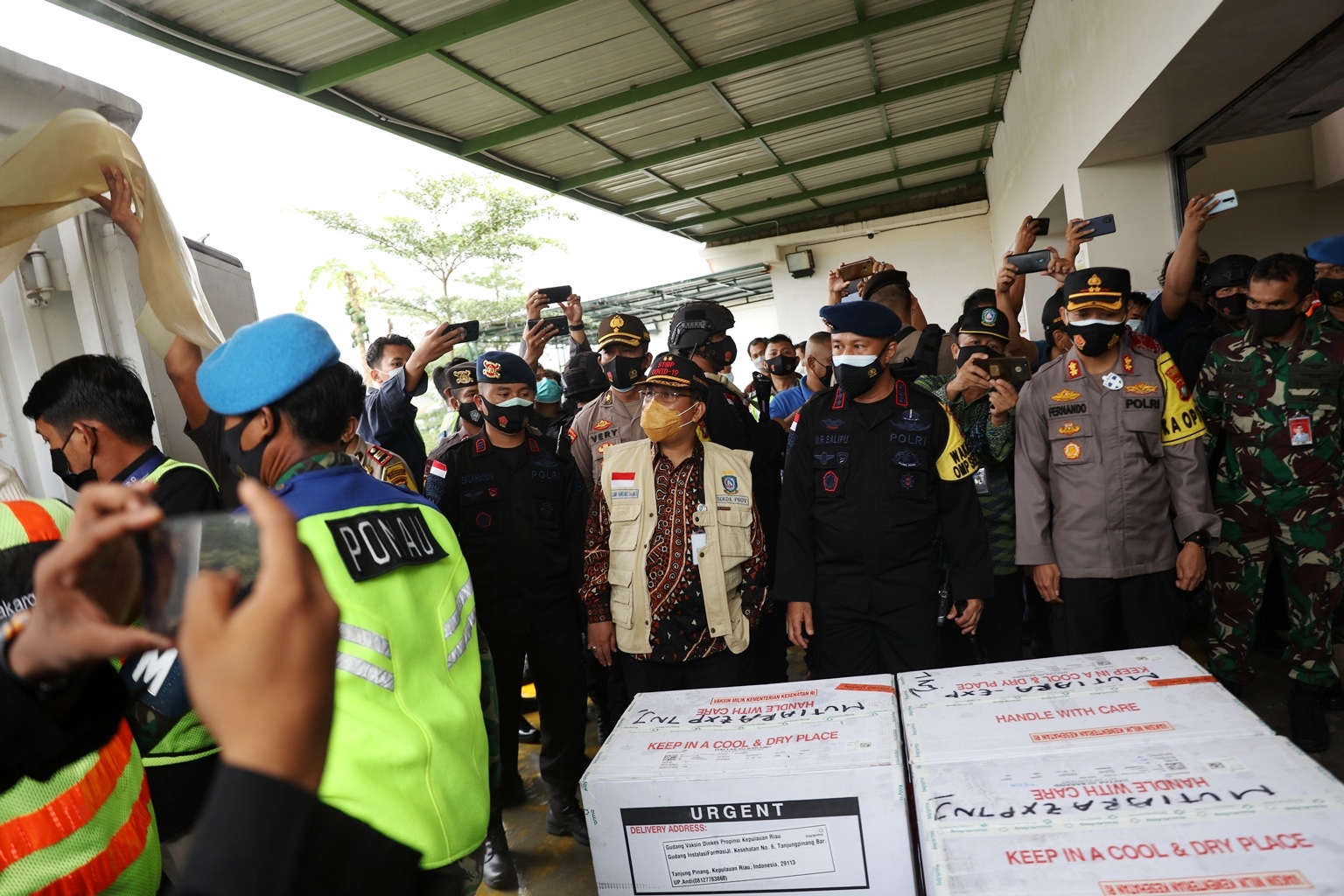 Sekretaris Daerah Provinsi Kepri H. T.S. Arif Fadilah menyambut kedatangan vaksin tahap dua sebanyak 12.250 dosis di gudang cargo bandara Raja Haji Fisabilillah (RHF), Tanjungpinang, Kamis (7/1). Kini Vaksin yang sudah datang keseluruhannya menjadi 25.250 dosis. Tahap pertama datang pada, Senin (04/1) sebanyak 13.000 dosis.