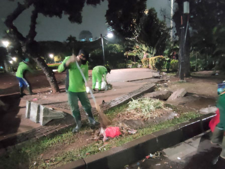 Dinas Pertamanan dan Hutan Kota DKI Jakarta mengerahkan 300 petugas untuk membersihkan taman, jalur hijau, dan fasilitas umum dari sampah sisa unjuk rasa Selasa (20/10).