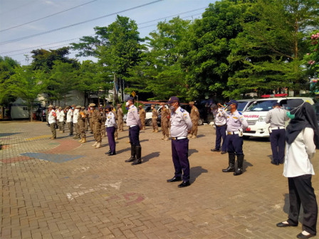 Sebanyak 80 petugas gabungan menggelar apel pengawasan Pembatasan Sosial Berskala Besar (PSBB) di halaman kantor Kecamatan Ciracas, Jakarta Timur, Jumat (25/9).