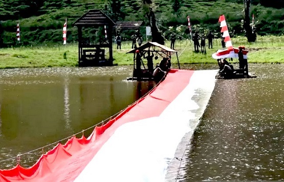 Mediaonline.co.id, BOGOR – Personel Komando Pasukan Khusus (Kopassus) dari Batalyon 14/Bhadrika Sena Baladika membentangkan kain merah putih berukuran raksasa di Telaga Saat, Kawasan Puncak, Cisarua, Kabupaten Bogor, Jawa Barat, Minggu (16/8).