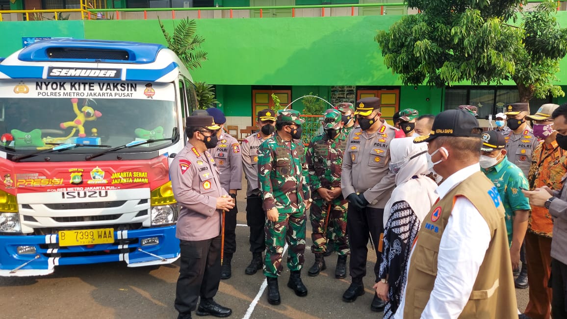 JAKARTA – Panglima TNI Marsekal Hadi Tjahanto bersama Kapolri Jenderal Listyo Sigit Prabowo dan Kementerian Kesehatan RI meninjau Gerai Vaksinasi Keliling Program Polres Jakarta Pusat bersama Kodim dan Pemda Jakarta Pusat. Rombongan meninjau tiga lokasi gerai di wilayah Polsek Sawah Besar, Tanah Abang, dan wilayah Gambir. Kapolri dan panglima juga menyerahkan bantuan kepada warga, Kami 22 Juli 2021.