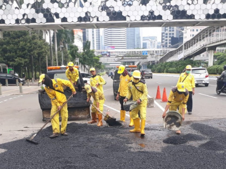 Tiga titik lokasi kerusakan di Jalan Jenderal Sudirman yang terdampak aksi unjuk rasa, Kamis (8/10) lalu, telah diperbaiki petugas Suku Dinas Bina Marga Jakarta Selatan.