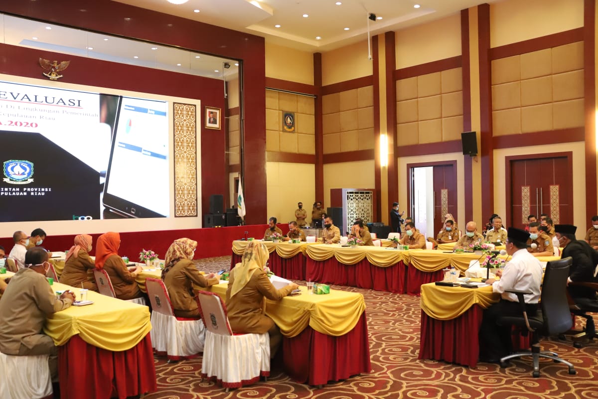 Pjs. Gubernur Kepulauan Riau H. Bahtiar memimpin secara langsung Rapat Rutin Evaluasi Pelaksanaan Pembangunan Provinsi Kepulauan Riau bersama seluruh kepala OPD di Aula Wan Sri Beni, Kantor Gubernur Kepulauan Riau, Dompak, Tanjungpinang, Senin (12/10).