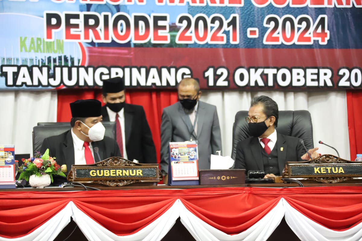 Tiga pasangan calon (Paslon) Gubernur dan wakil Gubernur Kepri, masing-masing paslon nomor urut 1 H. Soerya Respationo dan Iman Setiawan, paslon nomor urut 2 H. Isdianto dan Hj. Suryani serta paslon nomor urut 3 H. Ansar Ahmad dan Hj. Marlin Agustin menyampaikan visi dan misinya dalam sebuah sidang paripurna di kantor DPRD Kepri, Senin (12/10).