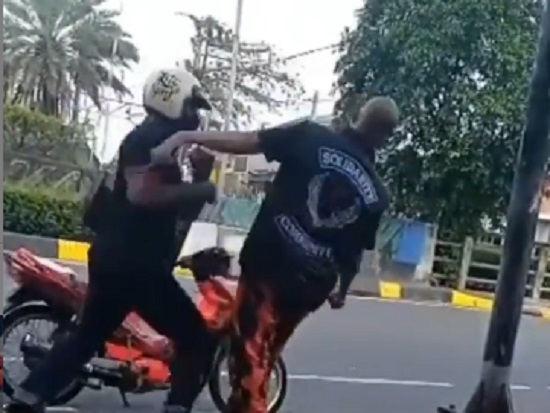 Pria yang mengenakan helm kemudian angsung melesatkan pukulan ke arah muka pria bercelana loreng oren itu. Pria itu pun langsung sempoyongan dan terus dipukul hingga jatuh terkapar. Belum diketahui kronologi bagaimana kedua pria tersebut baku hantam.