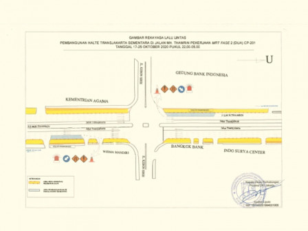 Untuk mendukung pekerjaan pembangunan halte sementara Transjakarta, sambung William, diperlukan manajemen rekayasa lalu lintas yang akan diberlakukan pada tanggal 17 – 25 Oktober 2020, mulai pukul 22.00 – 05.00, di depan Thamrin 10 Food & Creative Park dan di depan Bank Indonesia, dengan detail sebagai berikut;