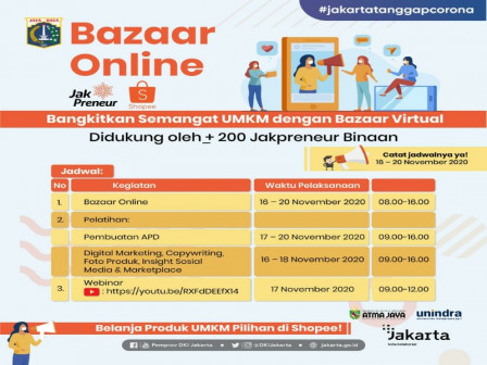 Sebagai wujud untuk memberikan wadah bagi pelaku Usaha Mikro, Kecil, dan Menengah (UMKM) yang tergabung dalam Jakpreneur, Pemprov DKI Jakarta menyelenggarakan Bazaar Online Jakpreneur.