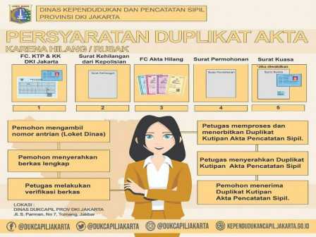 Kepala Dinas (Kadis) Dukcapil DKI Jakarta, Dhany Sukma mengatakan, ada beberapa persyaratan yang wajib dipenuhi sebelum melakukan duplikasi akta kelahiran. Beberapa persyaratan yang harus dibawa seperti fotokopi KTP dan KK DKI Jakarta, Surat kehilangan dari kepolisian, fotokopi akta yang hilang, dan surat permohonan alasan pembaharuan (bagi yang pembaharuan).