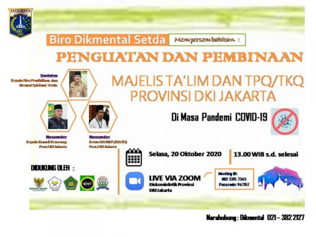 Biro Pendidikan Mental dan Spiritual (Dikmental) DKI Jakarta menggelar seminar online atau webinar dengan tema ‘Penguatan dan Pembinaan Majelis Ta’lim dan TPA/TKQ DKI Jakarta Di Masa Pandemi Covid-19’, Selasa (20/10).
