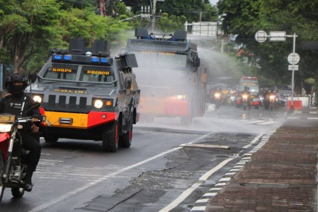 “Personel gabungan dari Brimob Polda Metro Jaya, Pemadam Kebakaran dan TNI dikerahkan untuk melakukan kegiatan disinfektan skala besar,” kata Pasi Ops Batalyon B Pelopor Satbrimob Polda Metro Jaya (AKBP. Imron Wahyudi).