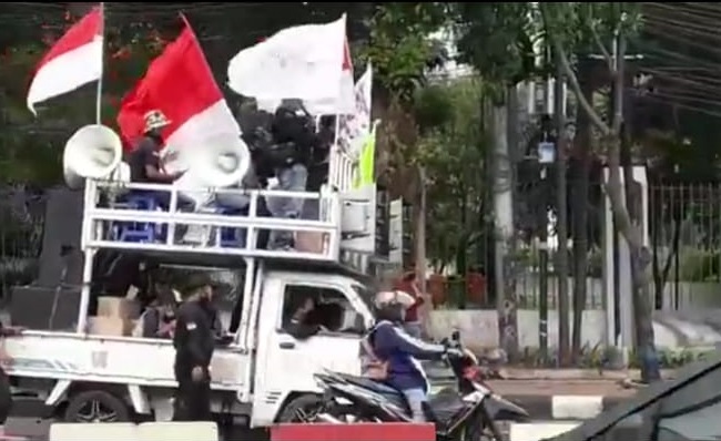 “Lahirnya UU Omnibus Law mengakibatkan pengusaha yang tadinya tidak nakal kini akan menjadi nakal semua. Maka kami dari aliansi PPMI dan SPSI sebagai saudara tua terus turun ke jalan tetap memperjuangkan apa yang menjadi tuntutan kami, batalkan UU Omnibus Law atau Jokowi mundur,” teriaknya dari atas mobil komando.