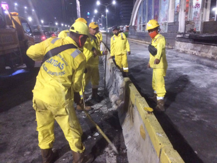 Dinas Bina Marga DKI Jakarta memperbaiki beton movable concrete bar rier (MCB) yang rusak karena aksi massa pada Kamis (8/10) kemarin.