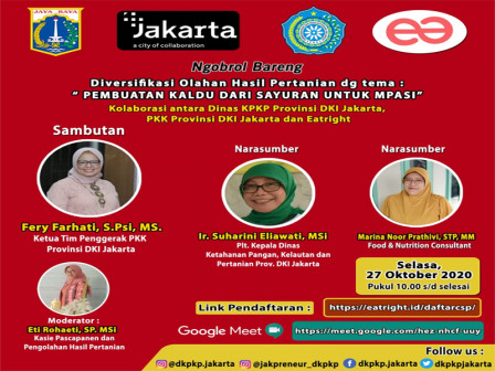 Dinas Ketahanan Pangan, Kelautan, Pertanian (KPKP) berkolaborasi dengan Tim Penggerak PKK DKI Jakarta menggelar webinar dengan tema ‘Pembuatan Kaldu Dari Sayuran Untuk MPASI’, Selasa (27/10). Kegiatan ini disiarkan secara virtual dengan aplikasi youtube dan google meet.
