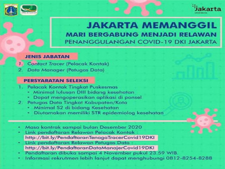 Informasi ini juga bisa diakses melalui website Dinkes DKI Jakarta melalui link https://dinkes.jakarta.go.id/rekrutmen-relawan-contact-tracer-pelacak-kontak-dan-data-manager-petugas-data-di-lingkungan-pemerintah-provinsi-daerah-khusus-ibukota-jakarta-tahun-2020/.