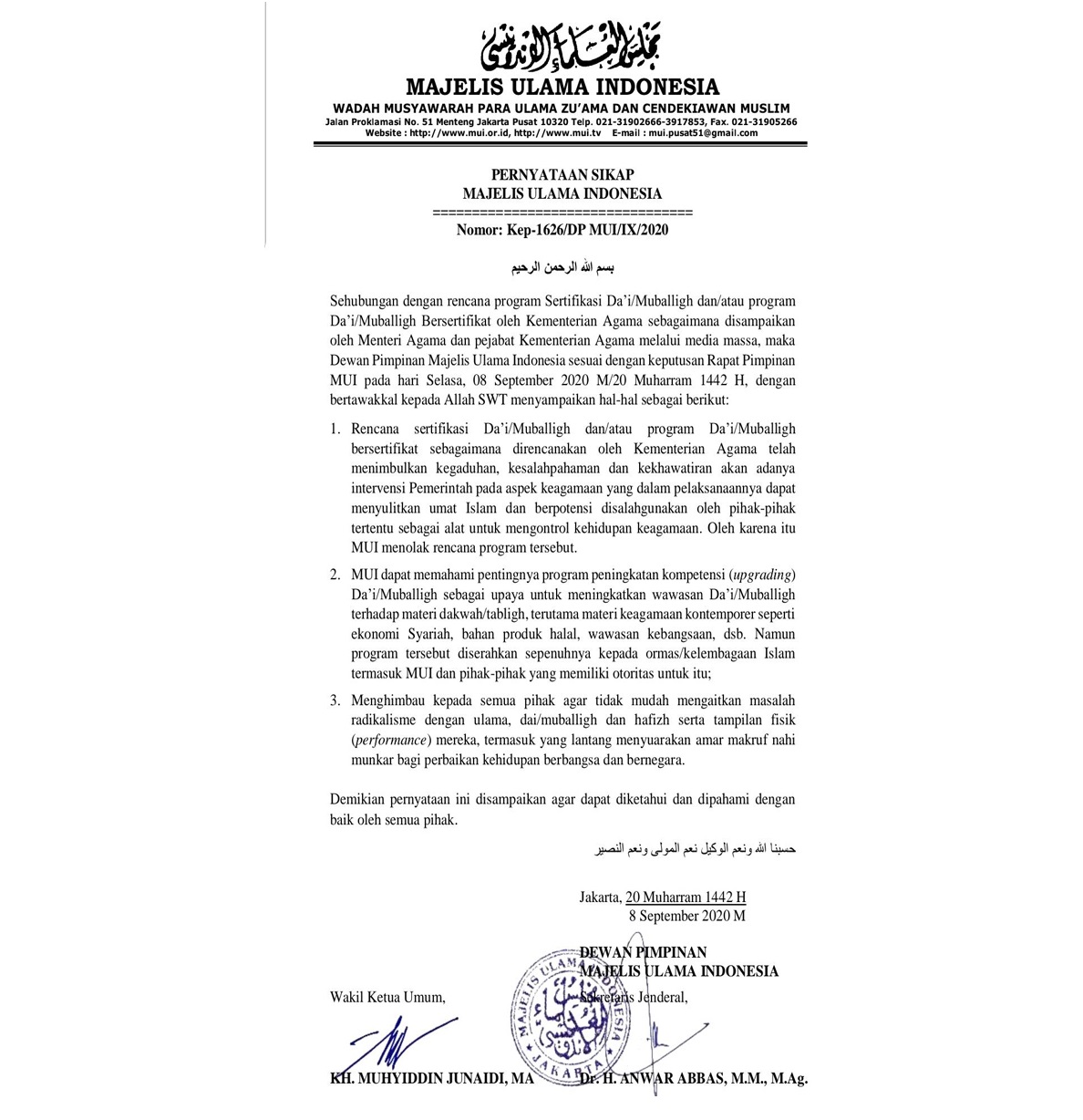 Surat resmi MUI itu ditandatangani oleh Wakil Ketua MUI, KH Muhyiddin Junaidi dan Sekretaris Jenderal MUI, Anwar Abbas pada Selasa, 8 September 2020.
