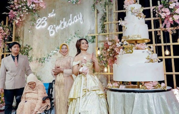 Lihat saja dari tempat pesta yang dipilihnya. Belum dekorasi bernuansa gold-white yang glamour, kue ulang tahun setinggi lebih dari 1 meter, dan deretan hadiah skincare mahal untuk para tamu.