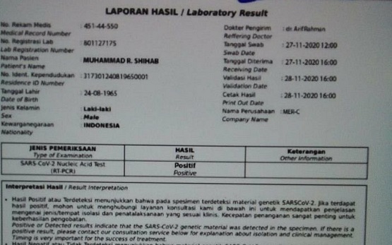 Tertulis validasi hasil telah dikeluarkan oleh MER-C dengan menyatakan hasil tes swab Muhammad R Shihab positif Covid-19 pada 28 November 2020.