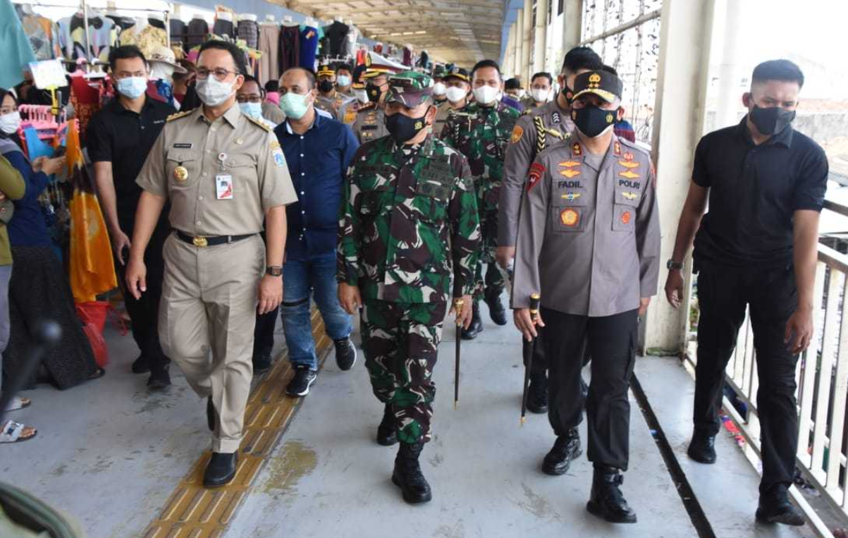 Jakarta – Gubernur DKI Jakarta (H. Anies Rasyid Baswedan, S.E., M.P.P., Ph.D), Kapolda Metro Jaya (Irjen. Pol. Dr. Drs. H. Muhammad Fadil Imran, M.Si), Pangdam Jaya (Mayjen. TNI. Dudung Abdurachman, S.E., M.M) dan Dirut Perumda Pasar PD Jaya (Arif Nasrudin), meninjau langsung Pasar Tanah Abang dan Kawasan Stasiun KA Tanah Abang.