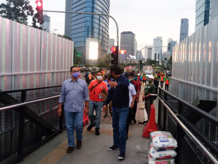 Gubernur DKI Jakarta, Anies Baswedan, Minggu (11/10) sore, meninjau perbaikan dua halte bus Transjakarta di Bundaran HI dan Tosari, Jakarta Pusat yang terdampak aksi unjuk rasa, Kamis (8/10) lalu.