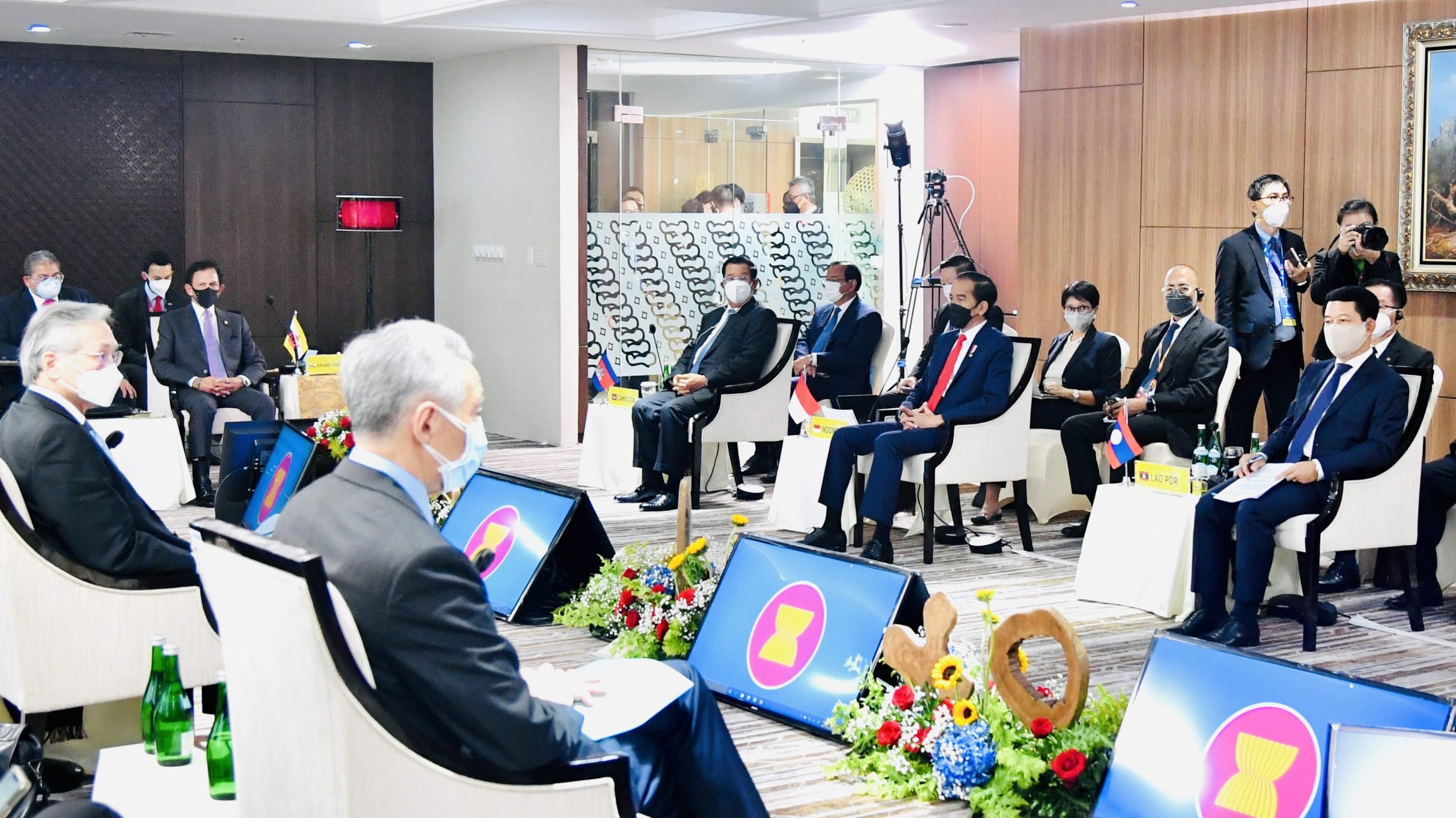 Presiden Republik Indonesia bersama dengan para pemimpin, serta perwakilan negara-negara ASEAN mengikuti ASEAN Leaders’ Meeting yang digelar di gedung Sekretariat ASEAN, Jakarta, pada Sabtu, 24 April 2021.