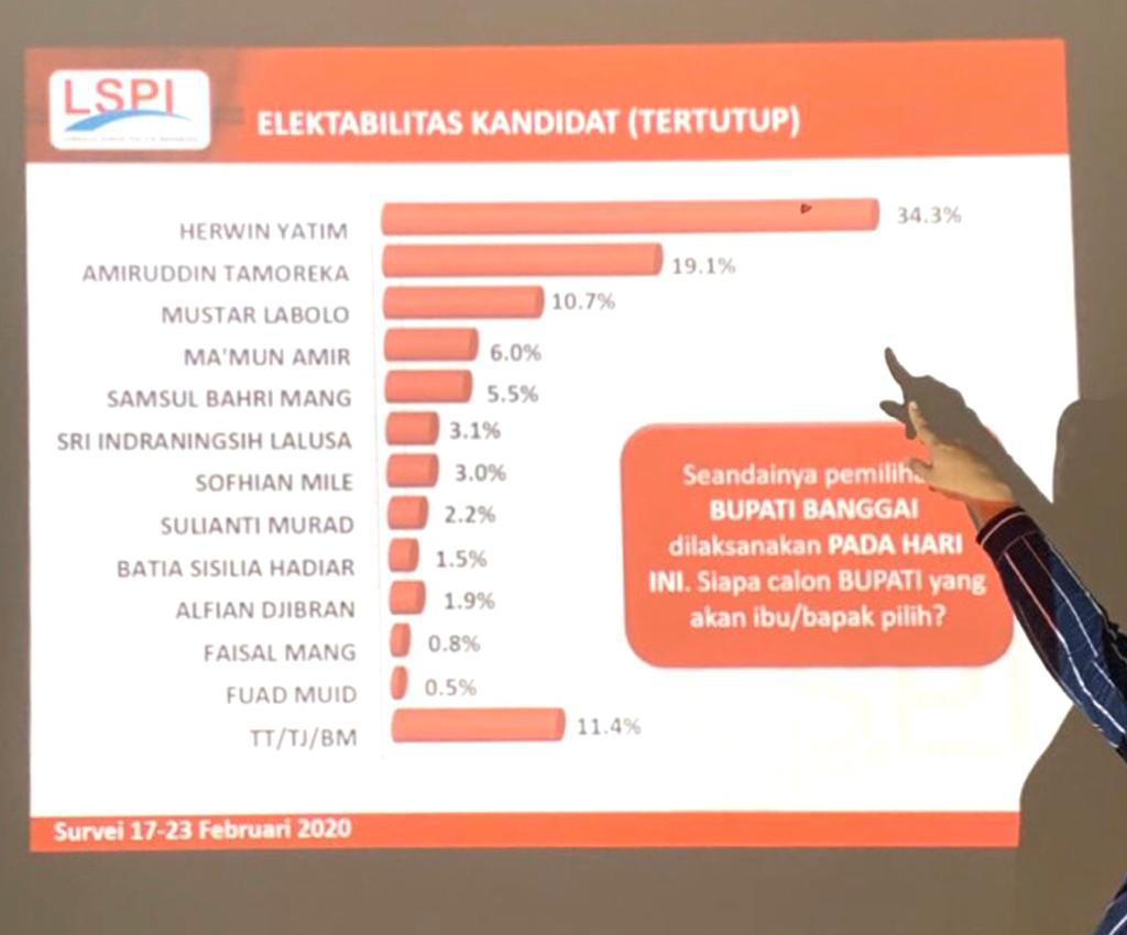 Berdasarkan survei Lembaga Survei Politik Indonesia (LSPI) yang dilakukan pada tanggal 17 sampai 23 Februari 2020, menyebutkan elektabilitas kandidat kategori Top of Mind calon Bupati Banggai 2020 adalah Herwin Yatim dengan prosentase 31,4 persen, kemudian disusul Amirudin Tamoreka 18,3 persen, lalu Mustar Labolo 9,8 persen.