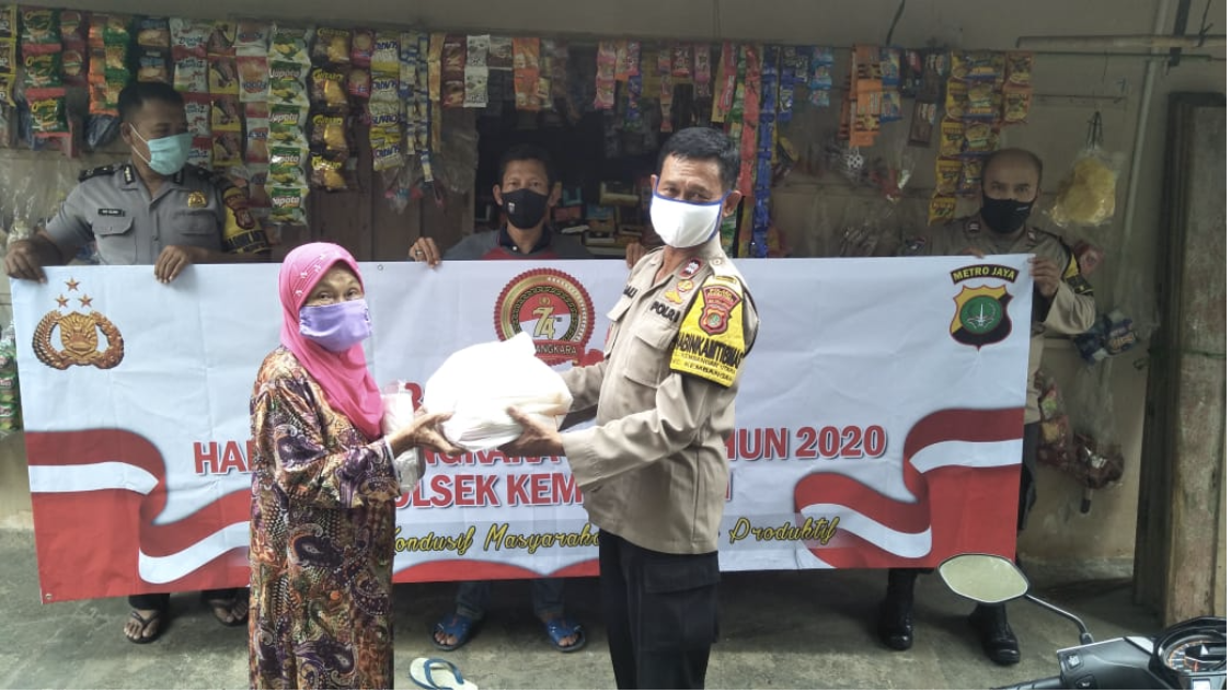 Jakarta – Minggu (21/06/2020) siang dalam rangka HUT Bhayangkara ke – 74, Polsek Kembangan, Polres Metro Jakarta Barat, Polda Metro Jaya melakukan kegiatan Bansos.