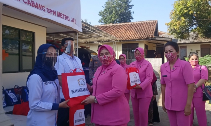 Sebanyak 450 paket sembako disiapkan dan dibagikan ibu-ibu Bhayangkari kepada warga secara langsung.