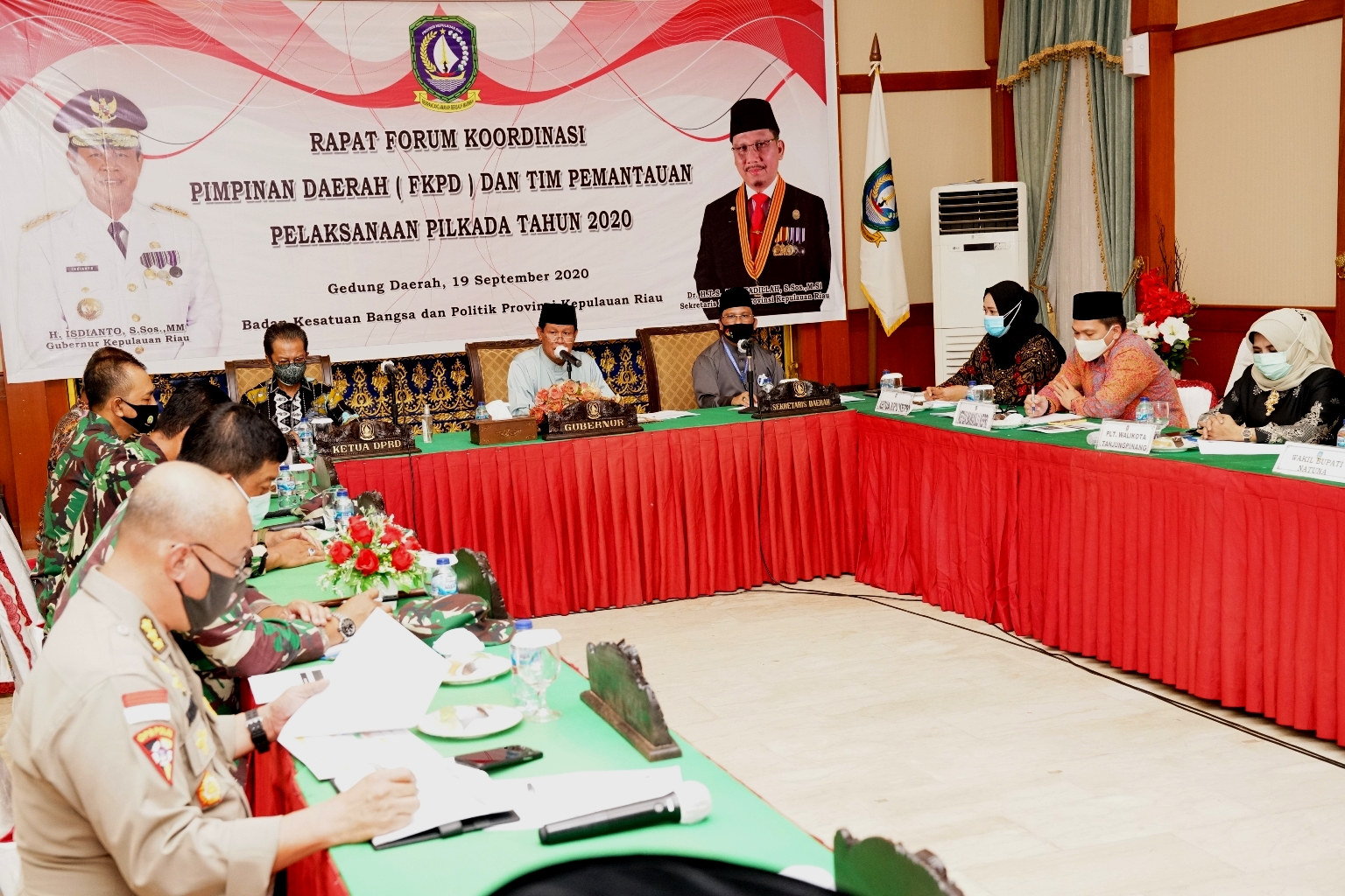 Gubernur Kepulauan Riau, H. Isdianto memimpin rapat Forum Koordinasi Pimpinan Daerah (FKPD) dan Tim pemantau Pilkada Kepri 2020 di Gedung Daerah, Tanjungpinang, Sabtu (19/9) siang.