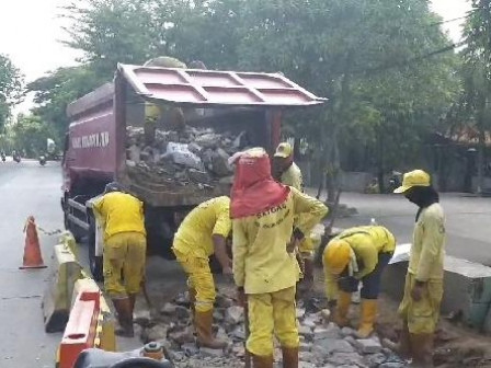 Suku Dinas Bina Marga Jakarta Utara memperbaiki jalan longsor di Jalan Raya Cilincing, RW 08, Semper Timur, Cilincing.