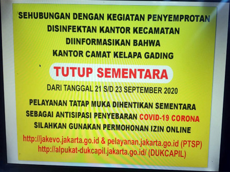 Pemerintah Kota Administrasi Jakarta Utara akan menutup sementara Kantor Kecamatan Kelapa Gading mulai Senin (21/9) hingga Rabu (23/9). Selama masa penutupan, layanan publik akan dilaksanakan secara daring.