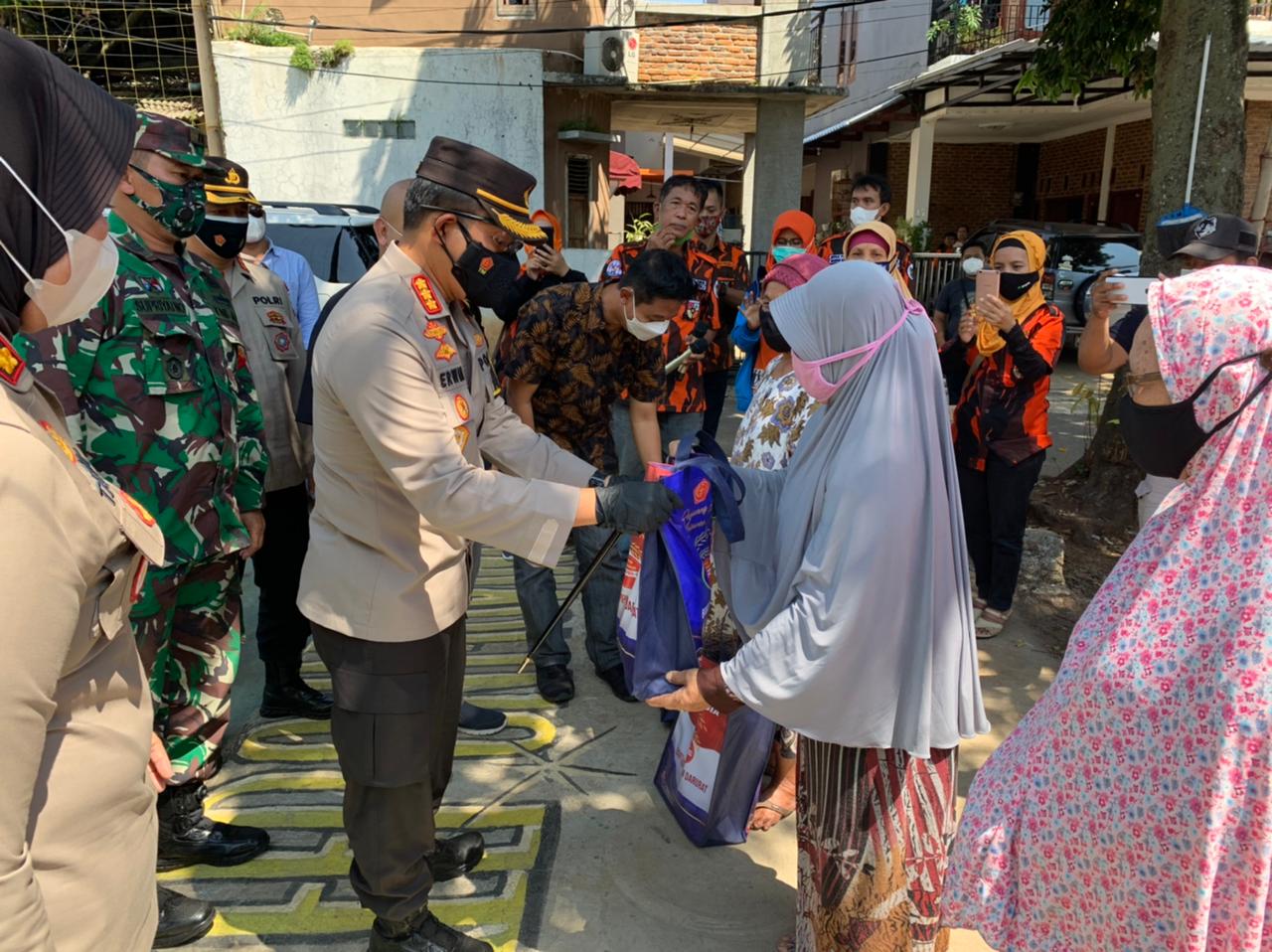 Kapolres Metro Jakarta Timur didampingi pejabat yang lain mengunjungi warga isoman dan memberikan bantuan sembako.