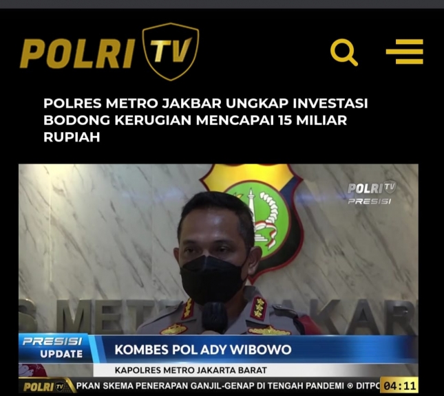 “Berdasarkan penggeledahan rumah tersangka, kita baru mengidentifikasi sebanyak 53 korban dari bukti-bukti yang ada dengan total kerugian mencapai Rp15,6 miliar. Namun, ini masih didalami, kemungkinan ada 100 orang korban yang ikut investasi ini jadi kerugiannya pun bisa lebih besar,” tutur Kapolres Metro Jakarta Barat Kombes Pol Ady Wibowo, dilansir dari program tayangan Presisi Update TV Radio Polri, di Mapolres Jakbar, Selasa (8/6/2021).