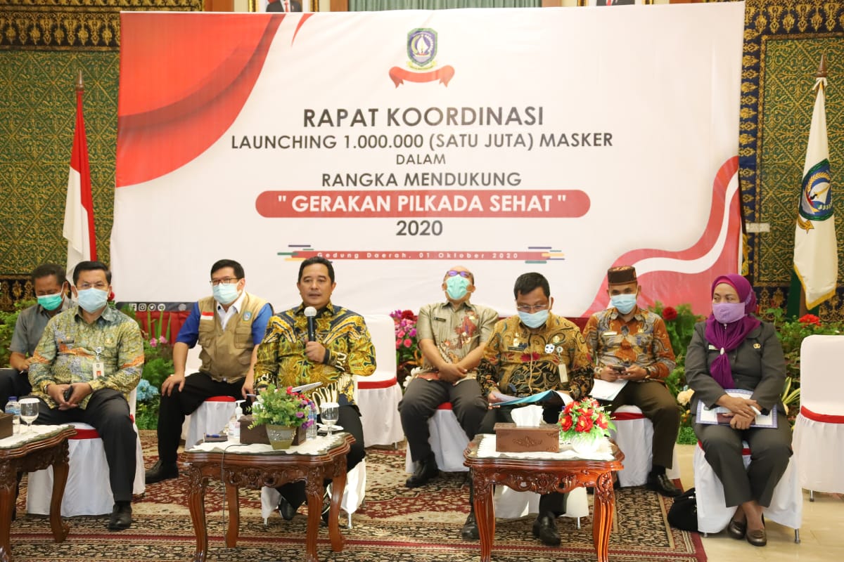 Penjabat Sementara (Pjs) Gubernur Kepri, Bahtiar Baharuddin memimpin Rapat Koordinasi Aksi Gerakan Sejuta Masker dalam mendukung Pilkada Sehat di Provinsi Kepulauan Riau bersama Bupati dan Walikota Se-Kepri melalui vicon dari Gedung Daerah, Tanjungpinang, Kamis (1/10) petang.
