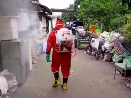 Suku Dinas Penanggulangan Kebakaran dan Penyelamatan (Sudin Gulkarmat) Jakarta Barat hari ini melakukan penyemprotan cairan disinfektan di lingkungan warga JL Toram II, RT 02/10, Tegal Alur, Kalideres, Jakarta Barat.