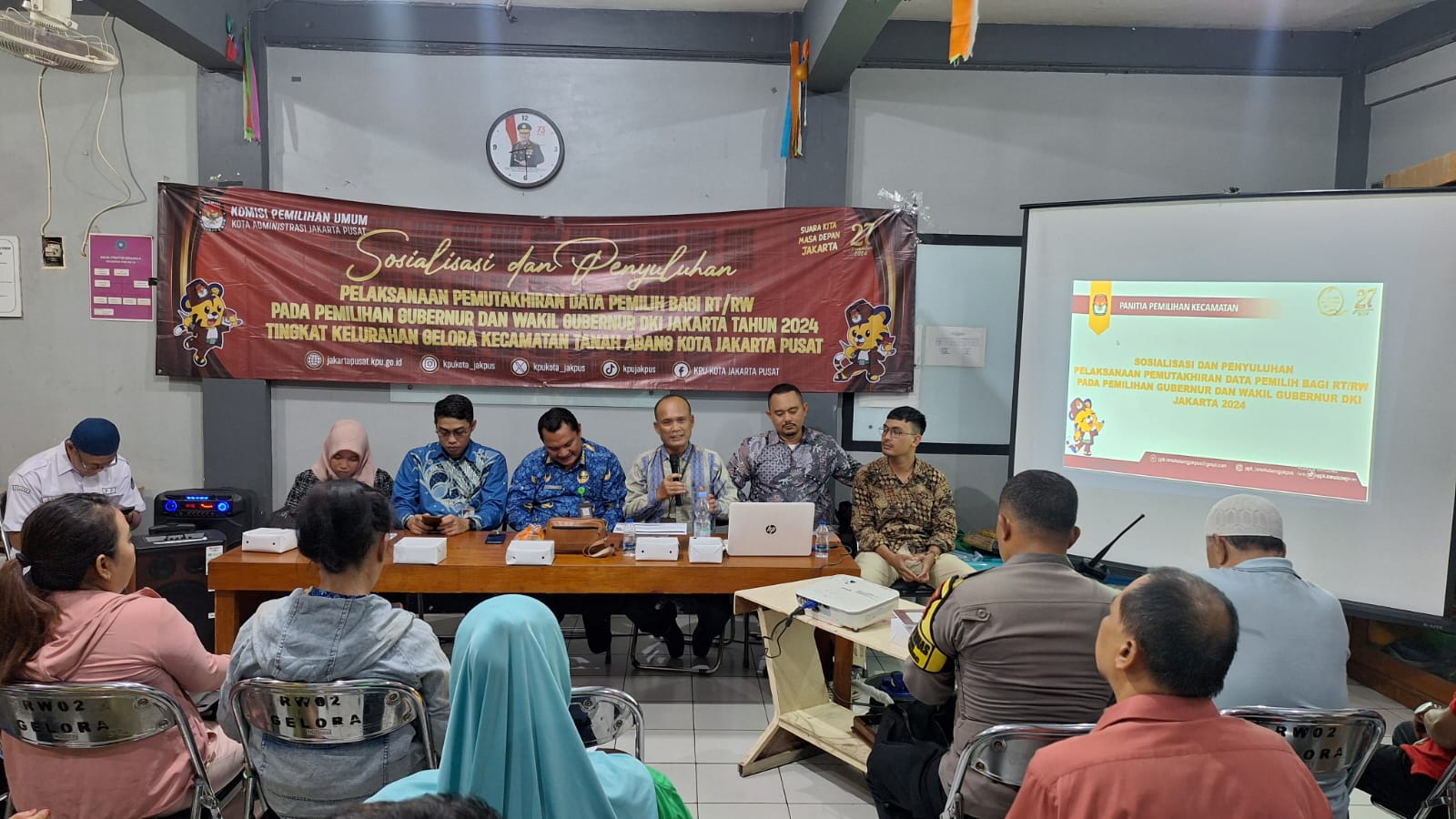 Kegiatan sosialisasi ini dilaksanakan oleh Usman selaku PPS Kelurahan Gelora dan dihadiri oleh PPK Kecamatan, Panwas Kecamatan, Lurah, PPS, Bhabinkamtibmas, Kasatpel Pol PP, PPL, Para Ketua RW, Perwakilan para Ketua RT, LMK, FKDM, Tokoh Masyarakat dan Tokoh Agama.