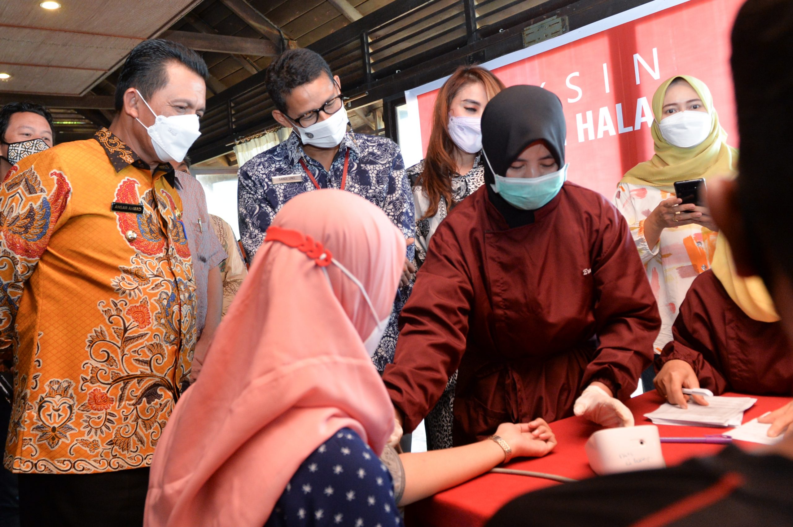 Menteri Pariwisata dan Ekonomi Kreatif Sandiaga Salahudin Uno didampingi Gubernur Kepulauan Riau H.Ansar Ahmad menyaksikan secara langsung pelaksanaan vaksinasi untuk pelaku pariwisata di kawasan Nongsa Kota Batam dan Lagoi Kabupaten Bintan. Pelaksanaan Vaksinasi Covid-19 dilaksanakan secara serentak kepada 1.500 orang pelaku pariwisata di Nongsa Batam dan  2100 orang pelaku pariwisata  di Kawasan Bintan Resort, Lagoi, Bintan.