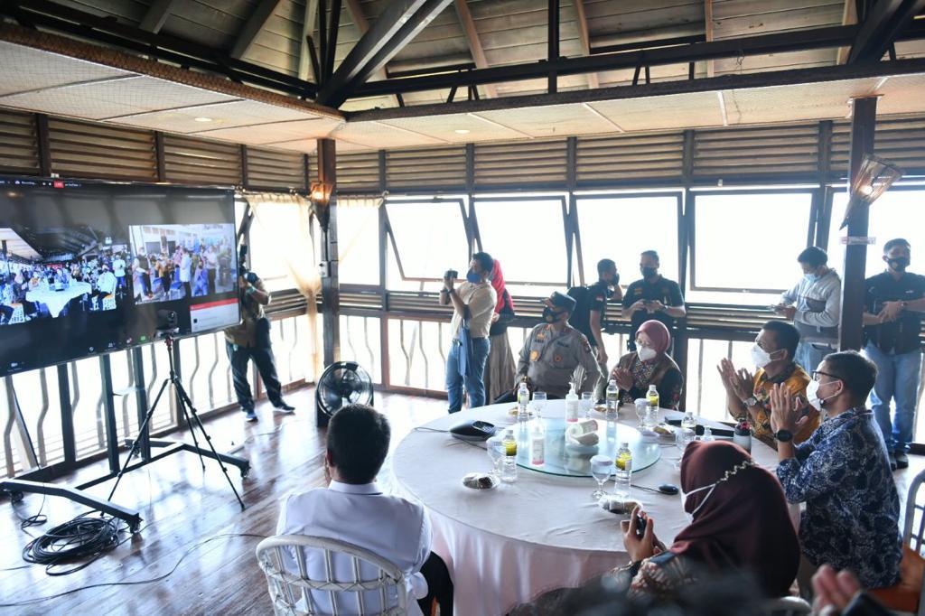 Usai menyapa pekerja wisata usai divaksin,  Kemenparekraf Sandiaga langsung melakukam Vicon dengan  Staf Ahli  Menteri Bidang Manajemen Krisis yang juga Koordinator Vaksinasi untuk pelaku pariwisata Henky Manurung yang berada di kawasan wisata Lagoi menyaksikan pelaksanaan vaksinasi di sana.