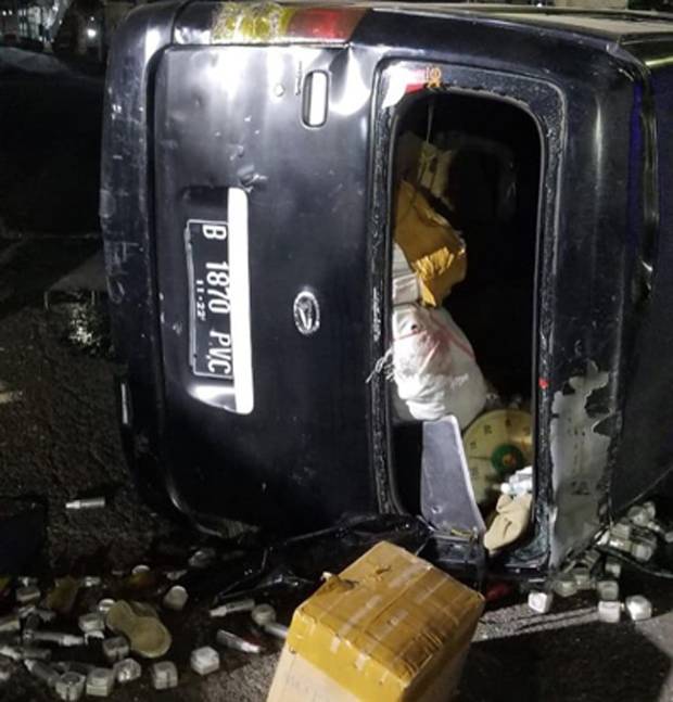 Dalam laporan itu, tampak minibus sudah dalam posisi terguling. Terlihat pula isi dalam mobil yang diketahui membawa produk SkinCare ternama itu tercecer di jalanan.