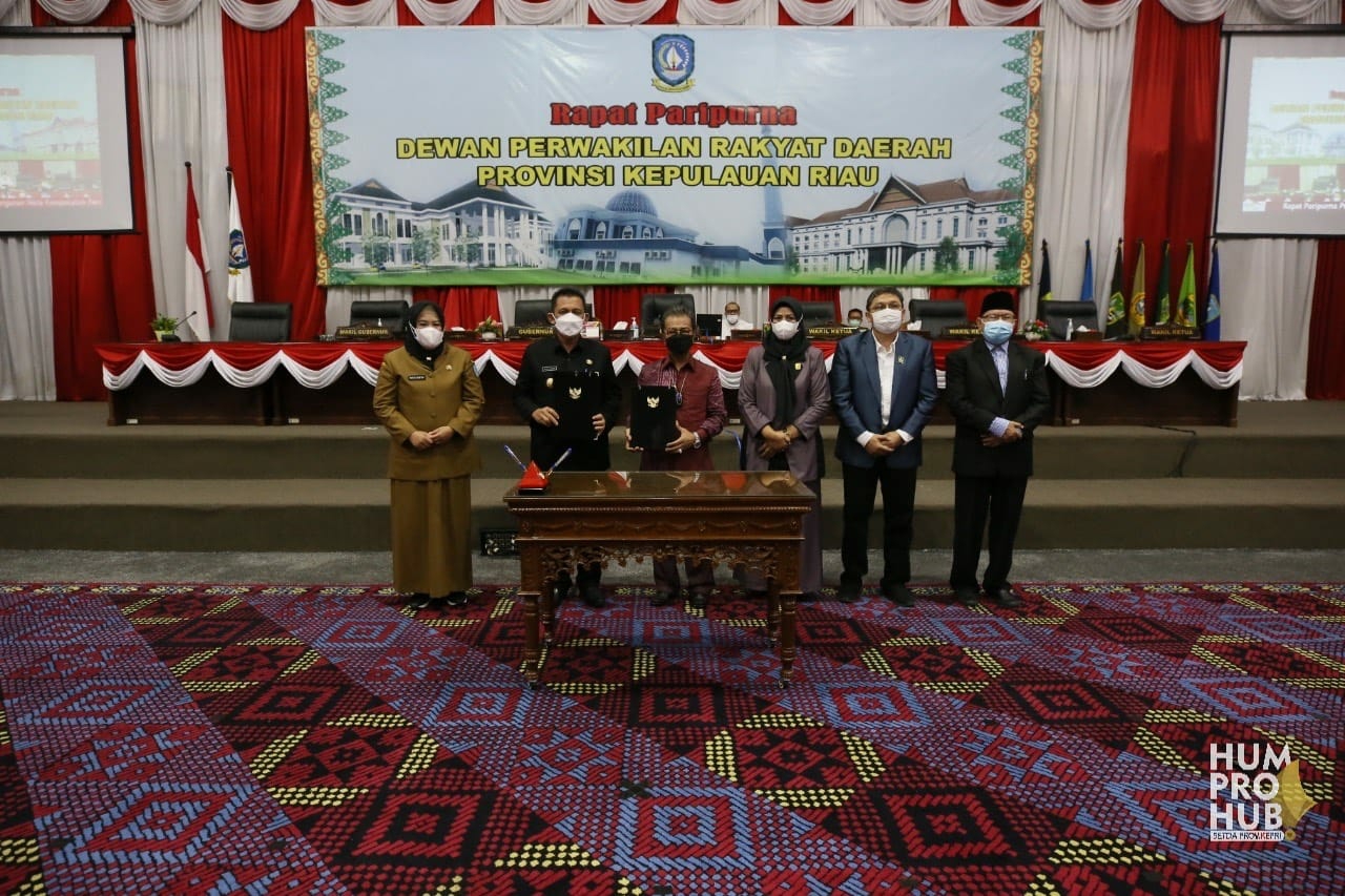 Gubernur H. Ansar Ahmad didampingi Wakil Gubernur Hj Marlin Agustina bersama Pimpinan DPRD Provinsi Kepulauan Riau melakukan penandatangan Nota Kesepakatan Rencana Awal RPJMD Tahun 2021-2026.