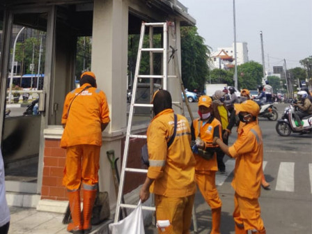 Petugas Penanganan Prasarana dan Sarana Umum (PPSU) Kelurahan Maphar, Taman Sari, Jakarta Barat bergerak cepat untuk membersihkan sampah dan serpihan kaca pos pantau Polantas di Jalan SW Pranoto, Taman Sari.