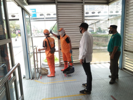 Petugas Penanganan Prasarana dan Sarana Umum (PPSU) Kelurahan Keagungan, Taman Sari, Jakarta Barat tanggap dalam membersihkan pecahan kaca halte Transjakarta Mangga Besar, Jalan Gajah Mada, Jakarta Barat.