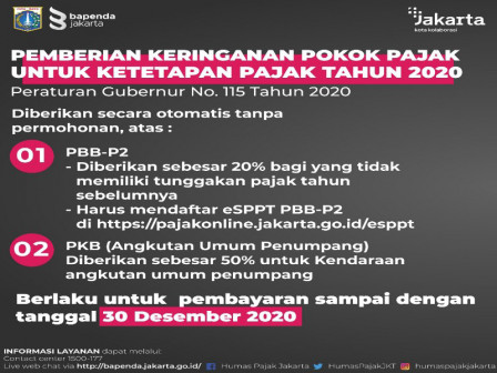 Kebijakan ini tertuang dalam Peraturan Gubernur (Pe rgub) Nomor 115 Tahun 2020 tentang Pemberian Keringanan Pokok Pajak dan atau Penghapusan Sanksi Administrasi Tahun 2020.