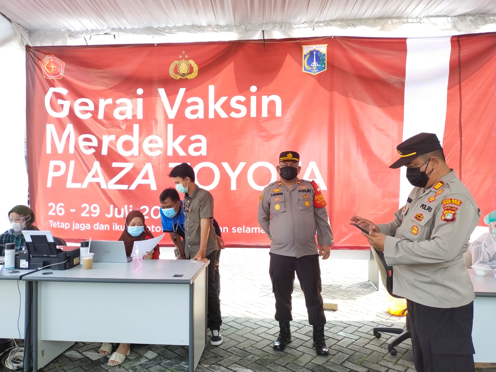 Jakarta – Bertempat di Jalan Panjang, Kedoya Utara, Kecamatan Kebon Jeruk, Jakarta Barat, Polres Metro Jakarta Barat menggelar Vaksinasi Massal bekerjasama dengan Plaza Toyota Kebon Jeruk, Senin (26/7).