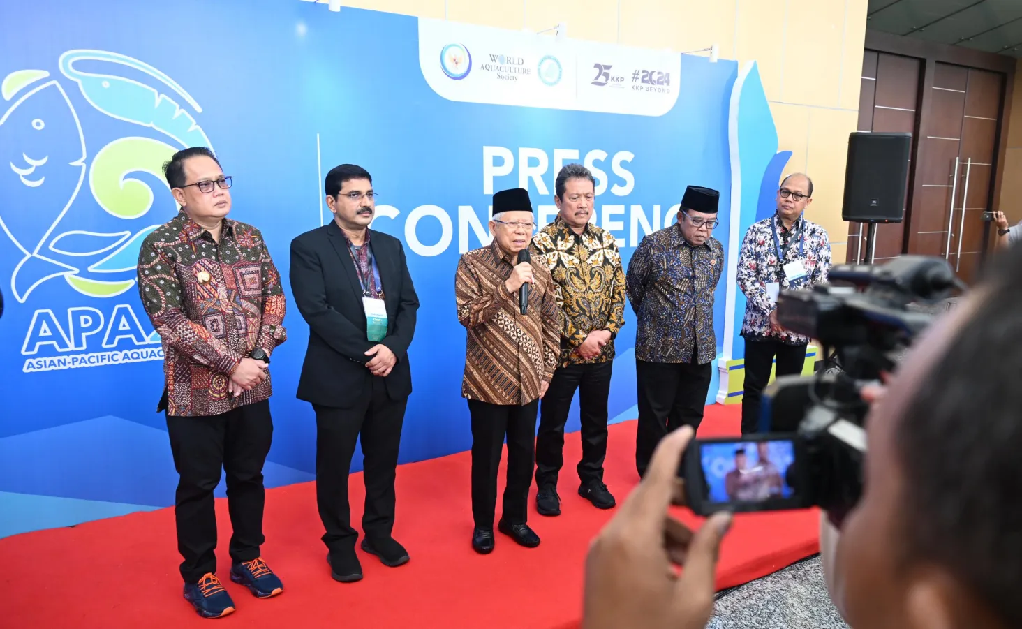 Mendampingi Wapres dalam keterangan pers ini, Menteri Kelautan dan Perikanan Sakti Wahyu Trenggono, Pj. Gubernur Jawa Timur Adhy Karyono, President World Aquaculture Society – Asia Pacific Chapter Khrisna Salin, Staf Khusus Wapres Bidang Komunikasi dan Informasi Masduki Baidlowi, serta Juru Bicara Menteri Kelautan dan Perikanan Wahyu Muryadi. (DPS/DMA/AS, rls)
