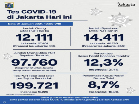 Kepala Bidang Pencegahan dan Pengendalian Penyakit, Dinas Kesehatan Provinsi DKI Jakarta, Dwi Oktavia memaparkan, berdasarkan data terkini Dinas Kesehatan Pemerintah Provinsi DKI Jakarta telah dilakukan tes PCR sebanyak 14.411 spesimen. Dari jumlah tes tersebut, sebanyak 12.111 orang dites PCR hari ini untuk mendiagnosis kasus baru dengan hasil 1.593 positif dan 10.518 negatif.
