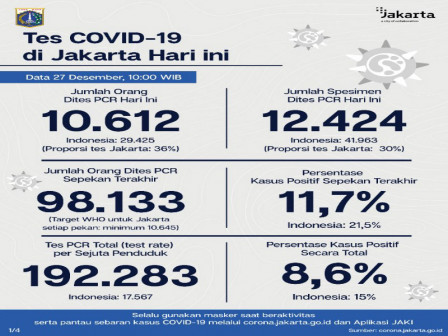 Kepala Bidang Pencegahan dan Pengendalian Penyakit, Dinas Kesehatan Provinsi DKI Jakarta, Dwi Oktavia memaparkan, berdasarkan data terkini Dinas Kesehatan Pemerintah Provinsi DKI Jakarta telah dilakukan tes PCR sebanyak 12.424 spesimen. Dari jumlah tes tersebut, sebanyak 10.612 orang dites PCR hari ini untuk mendiagnosis kasus baru dengan hasil 1.509 positif dan 9.103 negatif.