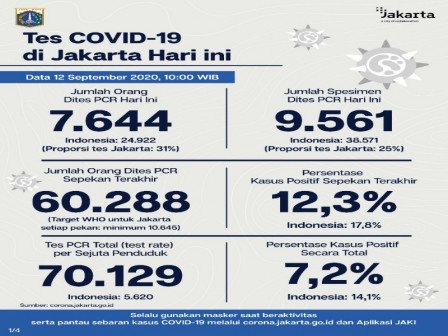 Kepala Bidang Pencegahan dan Pengendalian Penyakit Dinas Kesehatan Provinsi DKI Jakarta, Dwi Oktavia memaparkan, berdasarkan data terkini Dinas Kesehatan Pemerintah Provinsi DKI Jakarta telah dilakukan tes PCR sebanyak 9.561 spesimen. Dari jumlah tes tersebut, sebanyak 7.644 orang dites PCR hari ini untuk mendiagnosis kasus baru dengan hasil 1.440 positif dan 6.204 negatif.